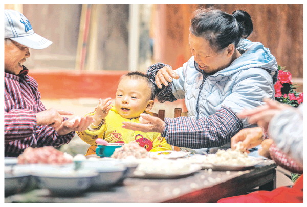家里老人和小朋友一起包“无嘴圆子”。 阳海翔 摄