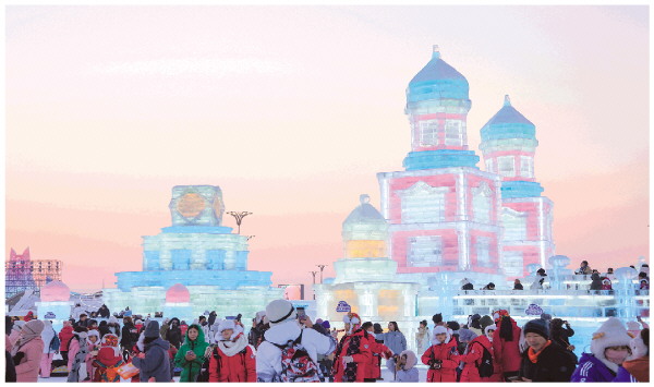 ◥游客在哈尔滨冰雪大世界园区内游玩、拍照(1月23日摄)。