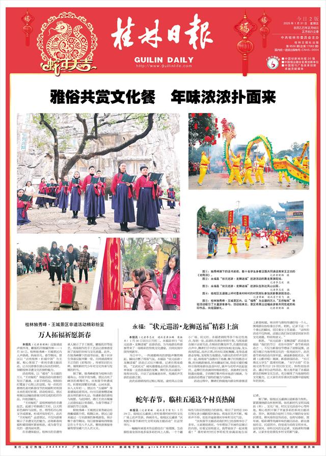 据悉,“状元巡游·龙狮送福”活动是永福县“我们的节日 欢乐中国年”春节系列活动之一,不仅为新春佳节增添了浓郁氛围,还成为展示当地传统文化的一张亮丽名片。此次春节系列活动内容丰富,涵盖新春联欢会、彩调(山歌对唱)展演、新春游园活动、“长江南北大学生”篮球对抗赛、“永宁古韵”灯会闹元宵等共计29项民俗文化、体育竞技活动。通过举办这些活动,极大地丰富了永福县群众的精神文化生活,充分展现了当地独特的文化魅力,让大家在欢乐喜庆的氛围中迎接蛇年的到来。