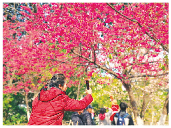 2月4日,春节假期最后一天,市民纷纷走出家门,享受春光。在南溪山公园内,樱花盛开,吸引了许多人前来赏花拍照。