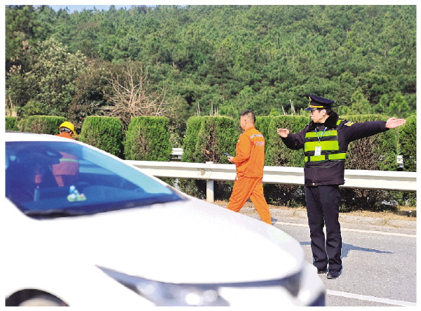 春运期间,张建新在高速公路上指挥交通疏解拥堵。