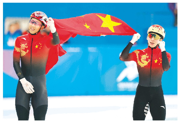 ◤2月8日,中国选手林孝埈(右)与孙龙在赛后庆祝。