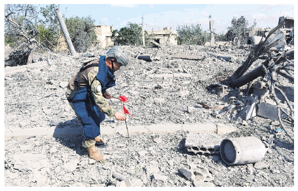维和部队多功能工兵分队扫雷连的战士在废墟中标识未爆物。