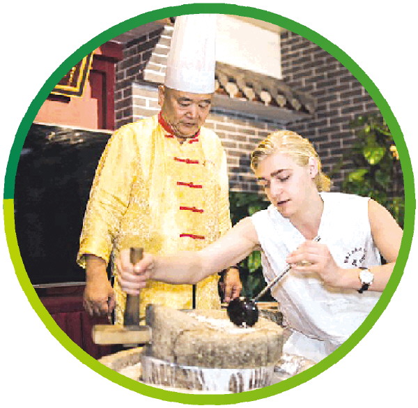 图⑤:梁志强指导德国弟子盖瑞将泡好的米碾磨成浆。 记者蒋璇 翻拍