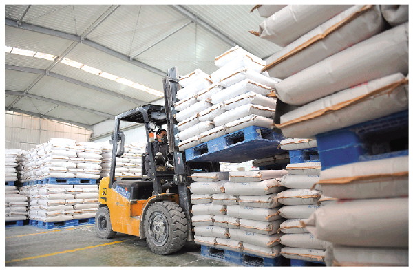 工人驱车将滑石粉整齐码放在仓库。 潘志祥 摄