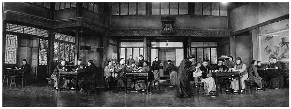 《茶馆》首演于1958年,焦菊隐导演为这个戏注入了鲜活的生命力,在第一幕中,为了烘托大茶馆的生活气息,除了原剧本中的角色,焦菊隐导演还设计了二十多个茶客角色,为每一个茶客都精心设计好不同的职业,并且事先在排练期间做好小品练习,他注重语言的行动性和行动的语言性,要求每个茶客有具体的动作,在训练时找出自己的心理动作线和形体动作线。