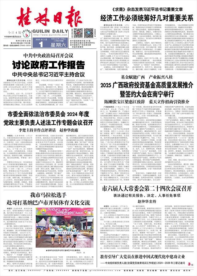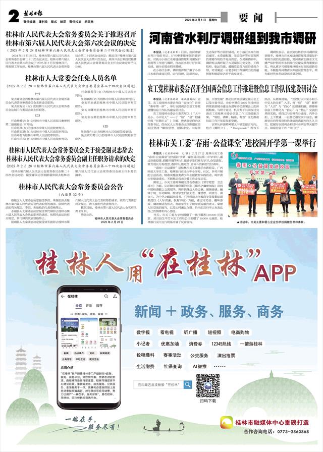 赵仲华强调,新春伊始市委召开的2025年桂林世界级旅游城市建设奋进年动员部署会,吹响了世界级旅游城市建设的奋进号角,唱响了加快高质量发展的主旋律,为做好今年人大工作指明了方向。市人大常委会要深入贯彻落实市委决策部署,牢固树立“实干为要、创新为魂,用业绩说话、让人民评价”的鲜明导向,进一步找准人大工作与市委中心工作的融合点,做到知责于心、担责于身、履责于行。要围绕“两个保护”,持续加强对相关地方性法规宣传贯彻实施的监督,通过联动开展执法检查和调研视察,落实“最严监督”。围绕高质量发展,聚焦突出科创赋能、加快文旅焕新、狠抓项目建设、大抓县域经济“四个抓手”,强化财经工作、产业发展、项目建设、营商环境等方面的监督,加快优化营商环境相关立法进程。围绕世界级旅游城市建设,做好《桂林市旅游市场秩序管理条例》报批工作,并推动做好宣传贯彻实施;持续强化《桂林世界级旅游城市建设发展规划》实施的监督。同时,充分发挥人大独特优势,深度参与世界级旅游城市建设、经济高质量发展等中心工作,在招商引资、项目建设、企业服务等领域展现担当作为,为推动桂林高质量发展、加快打造世界级旅游城市、奋力谱写中国式现代化桂林篇章贡献新的更大力量。
