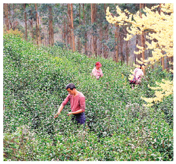 3月3日,在永福县永安乡军屯村的50亩“乌牛早”茶园里,30名茶农正抢抓早春晴好天气采摘头茬鲜叶。山坡上嫩绿的茶芽在枝头攒动,茶农们腰挎竹篓,指尖翻飞间将茶芽收入篓中,清新茶香随着山风飘散。作为早春茶品种,“乌牛早”在今年惊蛰节气前已进入采摘期。 记者李忠波 摄