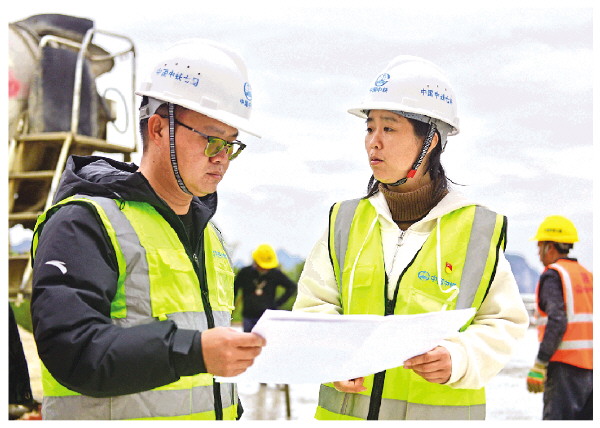柯双学(右)在福利大桥施工现场指导技术人员开展工作。 钟玲丽 摄