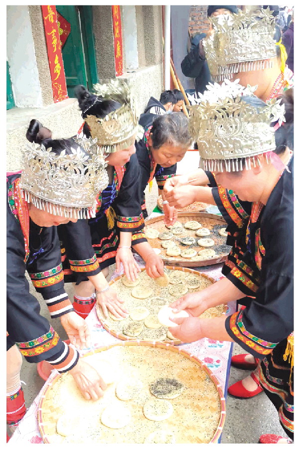 三月三,群众从各村寨走来,人潮摩肩接踵,热闹非凡,身着民族服饰的瑶族同胞特别引人注目。街道两侧,竹制品、干货、蔬菜等摊位鳞次栉比,还有一些人见缝插针地摆地摊。街道拐角处,一位民间艺人在出售二胡。他坐在小板凳上,悠闲地拉着二胡。几位中年男子围观演示,讨价还价。旁边,一位卖瑶族饰品的老奶奶也坐在小板凳上,头上的发髻高耸,黑头巾包裹,佩戴的银饰耳环又粗又亮。一个四五岁的小女孩站在老奶奶身边,瑶族服饰让她宛如一只花蝴蝶。她有灿烂的笑容。路人经过她时频频回首。一家杂货店门上,一件棕蓑衣高高挂起。这种旧时遮风挡雨的农用品不常见了,在此出现勾起一些人的童年记忆和乡愁。在这里,你还可以淘到心仪的纯手工制作的民族饰品,如头巾、腰带、背包等。乡政府路口,统一着瑶族服饰的女人们正在制作糍粑,供路人免费品尝。街道尽头的庙坪小学,对山歌、唱彩调、跳竹竿舞等活动井然有序。