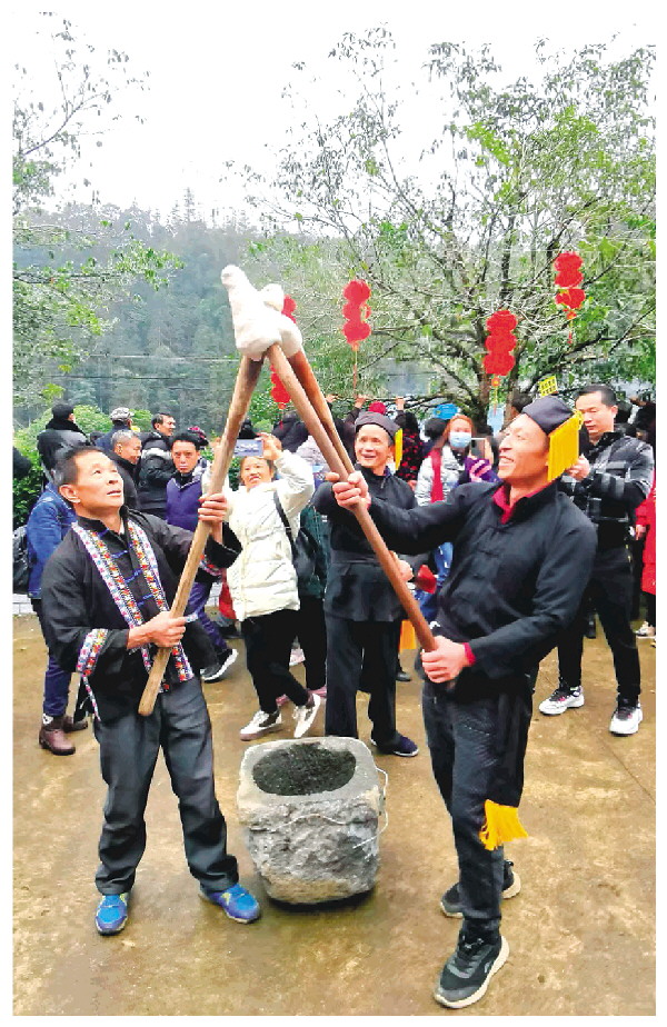 图①:“禁风节”上的宛田瑶族同胞在打糍粑