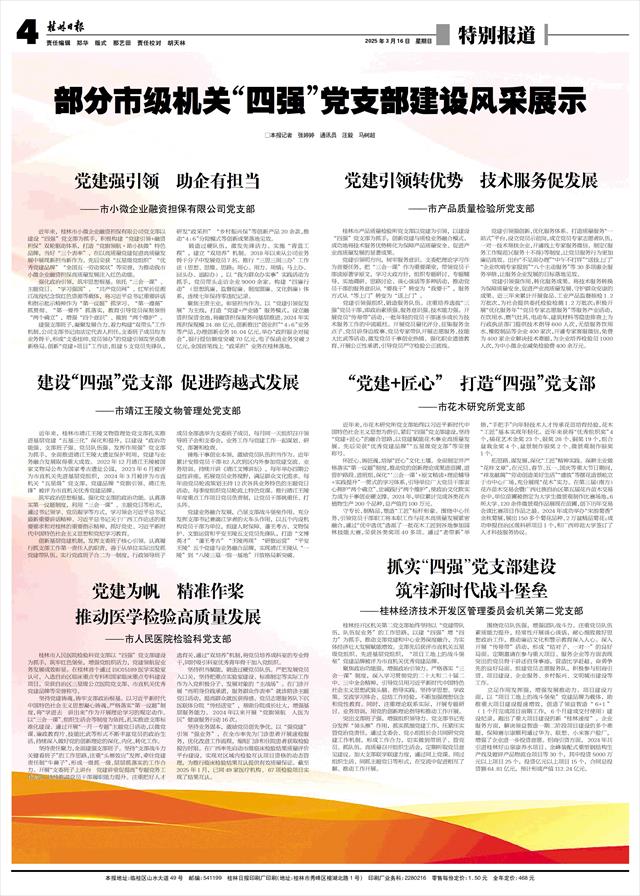 桂林市产品质量检验所党支部以党建为引领,以建设“四强”党支部为抓手,创新党建与质检业务融合模式,成功地将技术服务优势转化为保障产品质量安全、促进产业高质量发展的显著成果。