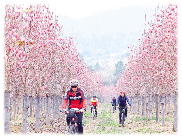 3月11日,骑行爱好者在一片紫玉兰花海中骑行。