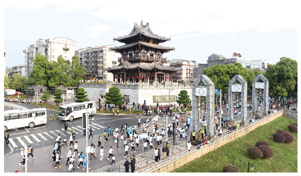 赛道沿途有多个景区、景点。图为选手们跑过逍遥楼。 王战飞 摄