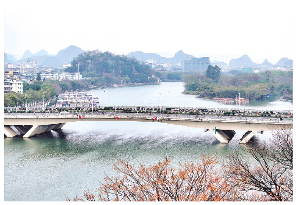 选手们从漓江桥上跑过,远处是桂林经典地标象鼻山,感受“人在画中跑”的绝妙体验。 记者唐艳兰 摄
