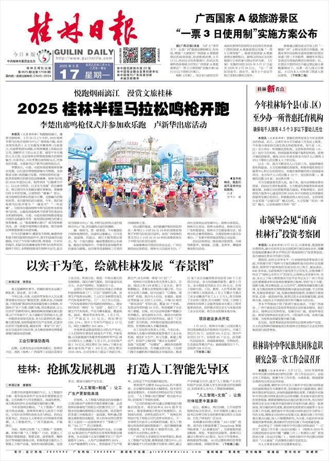 今年以来,市委、市政府带领全市人民认真贯彻落实自治区“解放思想、创新求变,向海图强、开放发展”推动经济高质量发展大会精神,牢固树立“实干为要、创新为魂,用业绩说话、让人民评价”的鲜明导向,聚焦唱响高质量发展主旋律,以“开年即开干、实干建新功”的昂扬斗志,进一步推进全面深化改革,全力以赴拼经济,凝心聚力抓发展,加快构建现代化产业体系,打造对内对外开放新高地,确保实现一季度“开门红”,奋力完成全年目标任务,全力推动桂林世界级旅游城市建设奋进突破。