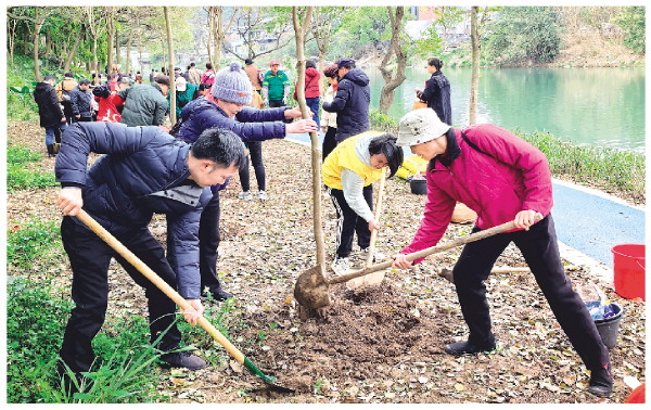在城市绿地“共建共管共享”活动中,市民在穿山小街水系公园种下一批树木。 李腾钊 摄