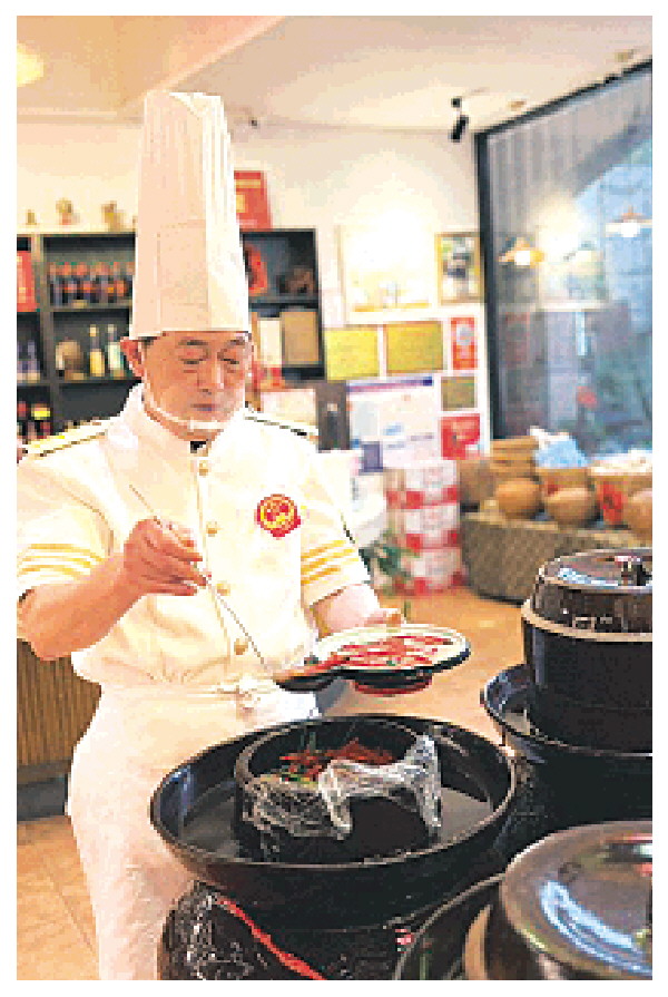蒋福财告诉记者,醋汁必须要用自制老坛里的酸水。“配醋要精准,多一分则锐,少一分则腥。”说话间,只见他拿起一只麻鸭,手起刀落,鸭血缓缓流入装满了老坛酸醋的碗中。醋血交融的瞬间,在碗中激荡出“酸香透骨”的奇韵。