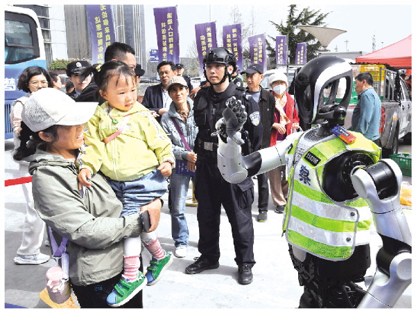 3月24日,警用机器人与群众互动。