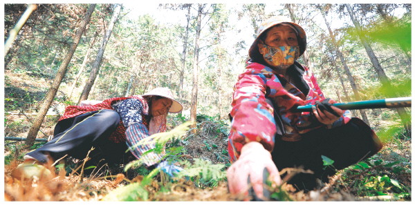 采访中,记者跟随天门村党总支部书记李良爬到海拔约800米的山林里,看到当地的药农们正弯着腰,熟练地将一株株淫羊藿幼苗栽种到松软的土壤中。