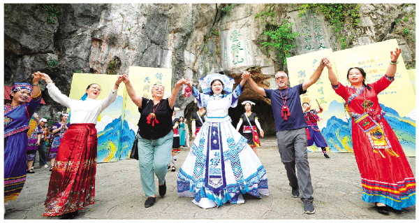 ▲3月27日,叠彩区叠彩街道在叠彩山举办“广西三月三 潮玩叠彩山”主题活动。社区居民与中外游客一起抛绣球、跳竹竿舞、尝民族特色美食,欢庆“广西三月三”。 记者何平江 摄