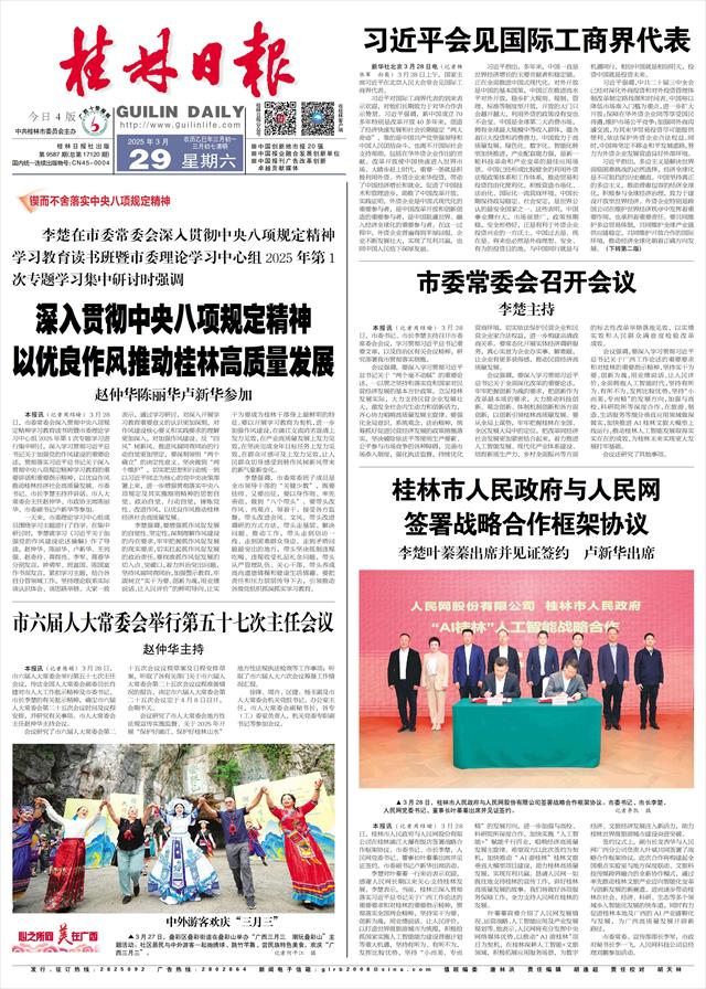 本报讯(记者周绍瑜)3月28日,市委常委会深入贯彻中央八项规定精神学习教育读书班暨市委理论学习中心组2025年第1次专题学习进行集中研讨,深入学习贯彻习近平总书记关于加强党的作风建设的重要论述,贯彻落实习近平总书记关于深入贯彻中央八项规定精神学习教育的重要讲话和重要指示精神,以优良作风推动桂林经济社会高质量发展。市委书记、市长李楚主持并讲话。市人大常委会主任赵仲华、市政协主席陈丽华、市委副书记卢新华等参加。