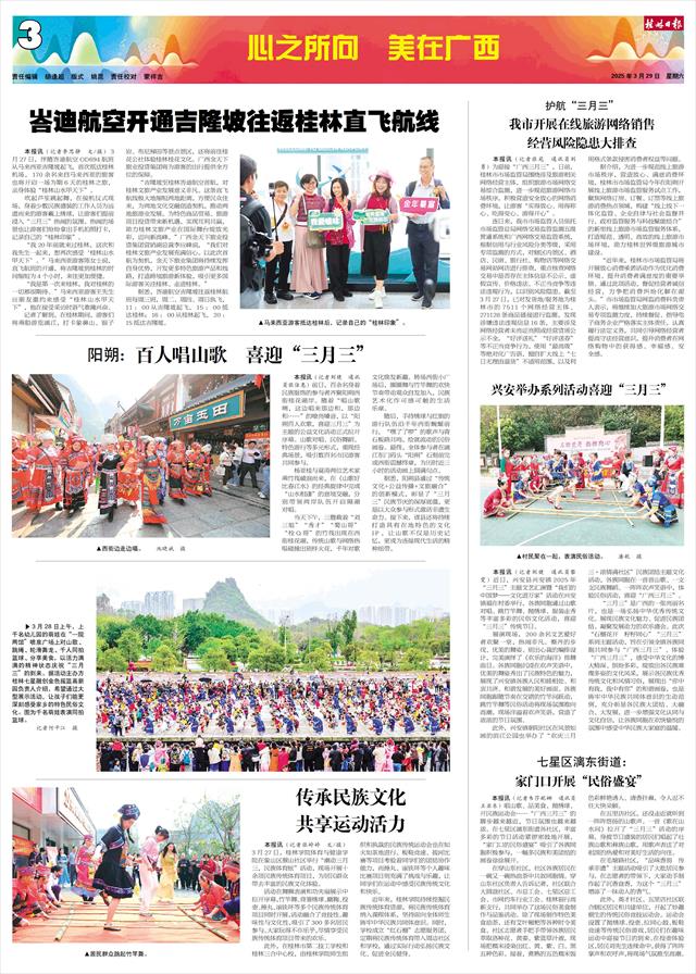 本报讯(记者韦莎妮娜 通讯员王亚东)唱山歌、品美食、抛绣球、开民族运动会……“广西三月三”的脚步越来越近,节日氛围也越来越浓。在七星区漓东街道各社区,丰富多彩的节日活动紧锣密鼓地开展,“家门口的民俗盛宴”吸引了各族同胞积极参与,一幅多民族和美团结的画卷徐徐展开。