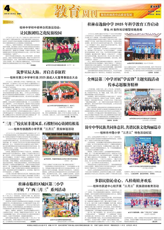 3月25日,桂林市跃进中心校以广西传统节日“三月三”为契机,举办民族团结教育主题活动。全校师生通过文艺展演、美术作品展和民族体育竞技相结合的方式,展现民族文化魅力,共绘民族文化传承画卷。