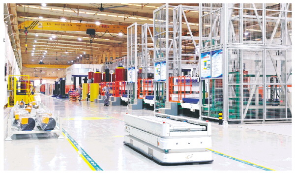 ▲在君泰福高端干式变压器数字化工厂内,只需在手机端一键下达任务,AGV背负式搬运机器人便会根据预设的路线自动行驶,将物料准确送达指定工位。