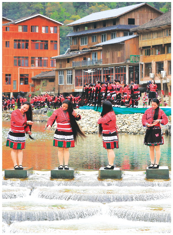 “以前我们守着寨子,日子过得平淡。”红瑶妇女潘凤飞回忆往昔谈今朝,脸上洋溢着幸福,“自从有了长发节,游客越来越多,我们的生活越过越好。”据了解,自2018年起,在当地政府的大力扶持下,中国长发科技馆在黄洛瑶寨落地生根。这座科技馆将红瑶千年蓄发传统与现代科技深度融合,围绕“长发”打造出丰富多元的产业形态,进一步提升了黄洛瑶寨的知名度,为其发展注入了源源不断的活力。