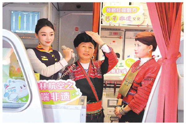 当天,在航班平飞后不久,龙胜瑶族服饰国家级非物质文化遗产代表性传承人潘继凤与空乘人员身着红瑶传统服饰出现在客舱,为旅客介绍红瑶的历史渊源、民族风情和精湛的手工技艺。