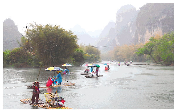 3月29日,独属广西人的“三月三”假期首日,阳朔遇龙河景区游客络绎不绝,绵绵小雨挡不住大家对这一方山水的向往。雨中的遇龙河更多了几分仙气,让游客流连忘返。近年来,农行桂林阳朔支行积极发放贷款支持阳朔县全域旅游,打造桂林世界级旅游城市先导区,其中在遇龙河投放贷款5000余万元,支持旅游公司改善基础设施、两岸村民升级民宿等,提升游客旅游体验,广受游客好评。 伍文悄 文/摄