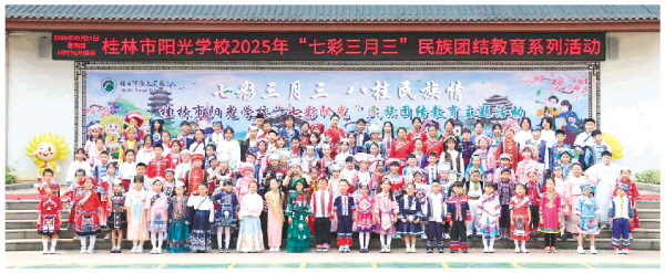 近日,当记者踏进桂林市阳光学校校门瞬间,悠扬动听的壮族唢呐声与糯米饭诱人的甜香味交织在一起,扑面而来,令人沉醉。教学楼前,一群身着少数民族服饰的孩子正欢快地跳着竹竿舞,开心爽朗的笑声惊起枝头栖息的鸟儿。此刻的校园内,一场主题为“七彩三月三,八桂民族情”的民族团结教育活动,正以其丰富独特的形式,生动诠释着民族团结教育的深层内涵。