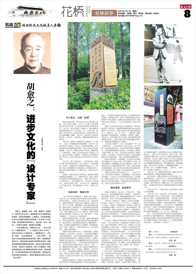 “永远向着未来,不要怀念过去,一切为了明日,不要迷恋昨日。”——这是在上世纪40年代,胡愈之所写的《少年航空兵——祖国梦游记》一书中的一段话。“永远向着未来”“一切为了明日”,是胡愈之毕生执着追求的真实写照。那时,他刚刚离开桂林不久。虽然在桂只有短短不到两年的时间,但他在这里积极拓展新闻出版业务、创办文化供应社和生活书店,并撰写了大量文章,进行了大量演讲,把抗战思想和进步文化传播到桂林的各个角落。在桂林期间,由于他在宣传进步文化方面主意多,展现出非凡的组织能力和创造力,朋友们都称他为进步文化的“设计专家”。