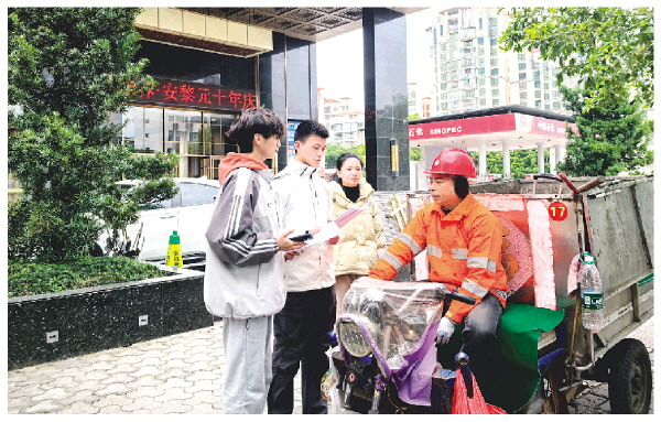 桂林师范学院学生与叠彩环卫站环卫工人交流。尹霖之 摄