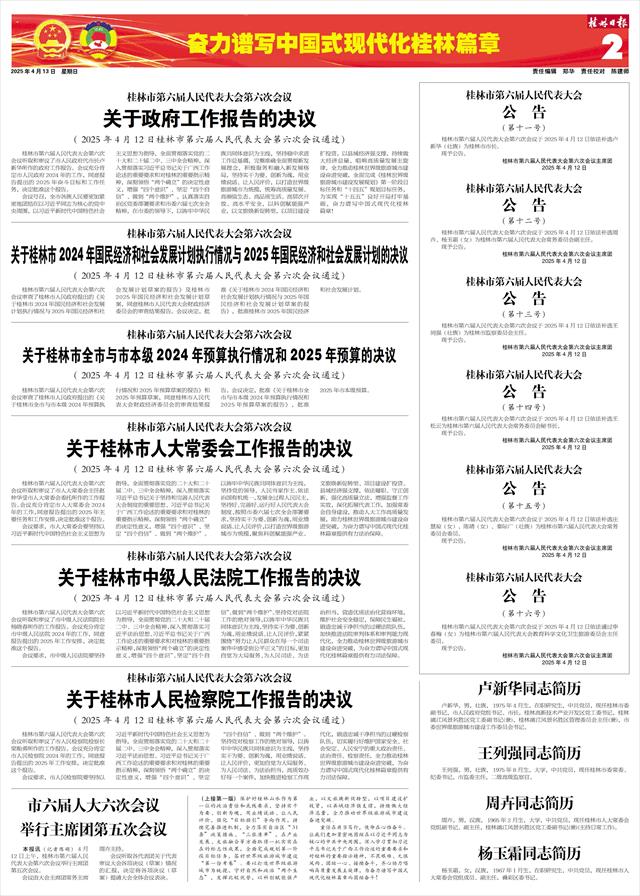 公 告 (第十二号)   桂林市第六届人民代表大会第六次会议于2025年4月12日依法补选周卉、杨玉霜(女)为桂林市第六届人民代表大会常务委员会副主任。