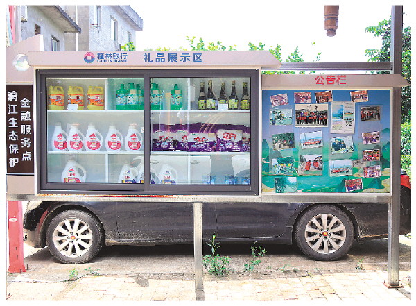 ▲桂林银行漓江生态保护金融服务点礼品展示区。