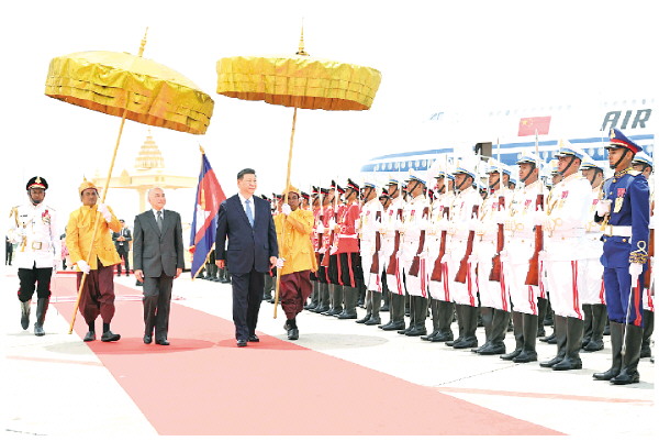 两国元首登上检阅台。军乐团奏中柬两国国歌。习近平在西哈莫尼陪同下检阅仪仗队。两国元首分别同对方陪同人员握手致意。