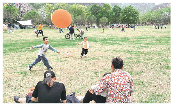 周末,“一院两馆”旁边的临桂山水公园里,孩子们或放风筝、玩气球,或骑自行车;大人们则在树荫下扎下帐篷,耐心陪小朋友玩耍,惬意悠然。多年来,农行桂林分行累计投放信贷资金数十亿元,支持桂林打造世界级旅游城市,支持“一院两馆”等桂林新区核心文化设施、机场高速等城市基础设施建设。如今,新区随着市政府及机关单位的迁入,人口和产业集聚,基础设施(如道路、学校、医院)逐步完善,成为桂林新的政治经济中心,吸引了越来越多的市民在此安居兴业。图为市民在山水公园休闲玩耍。 伍文悄 摄