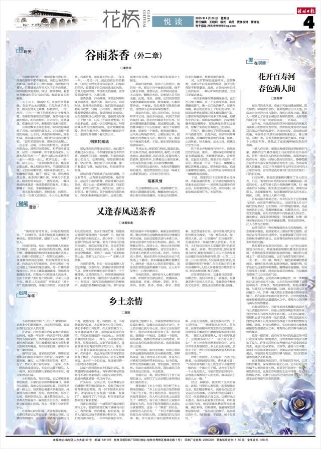 山那边飘来去年的茶谣,阿妹的银镯碰响了谷雨,而阿哥的蓑衣上,正挂着整个茶园的雨滴。山水间,采茶的阿哥阿妹,身影忙碌,面对满山茶树,他们把久远的山歌传唱。“四月采茶茶叶香,哥妹约好去爬山。一边走来一边唱,不怕山高村路长。茶树种在那高山,清明谷雨采茶忙。和平茶叶香又香,品尝一口精神爽。和平就是我家乡,山清水秀好风光……”歌声与满山的茶香伴在一起……稍息一会儿,歌声又起,一唱一和,深入人心。“采茶阿妹快乐多,桃园茶山唱山歌。晚上唱到金鸡叫,早晨唱到日落坡。又到谷雨嫩芽香,阿妹采茶碌忙忙。不怕腰酸汗洗脸,摘了一筐又一筐。春风拂面茶山香,新茶两片嫩叶黄。阿妹巧手把茶采,烧茶盼哥来品尝。”置身此地,一脉风骨或传承就是一场浓墨重彩的春光。只要山歌嗓子一亮起,幸福就满溢出来。