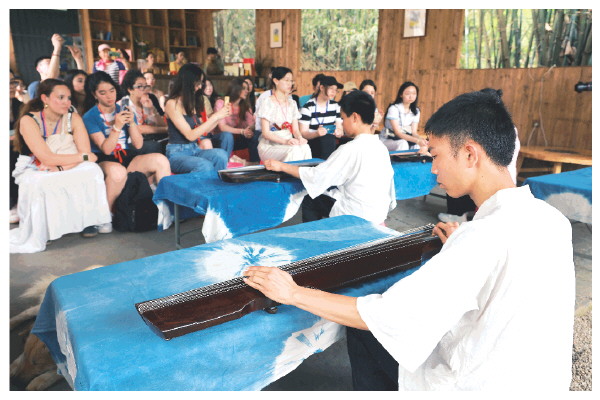 活动中,阳朔青少年代表为法国青年学子表演古筝弹奏。