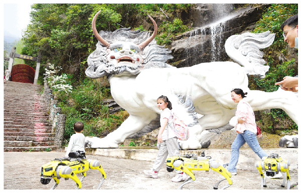 ▲4月19日,2025猫儿山高山杜鹃花文化旅游季启动。图为游客在猫儿山招摇谷与马蜂窝AI机器狗同游。 记者唐艳兰 摄