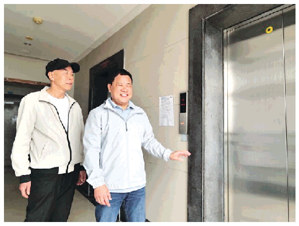 桂圳城市领地小区是我市首个享受到老旧电梯更新改造补贴的小区。图为业委会负责人在向记者介绍新电梯运行情况,小区居民也对新电梯表示满意。记者韦莎妮娜 摄