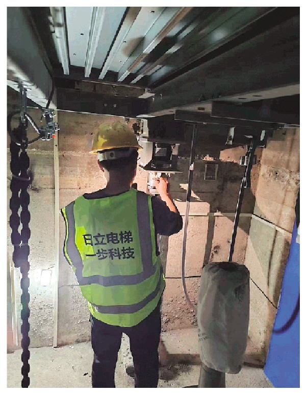 图为技术工人正在桂圳城市领地小区施工,为小区安装新的电梯。(广西一步加装电梯服务有限公司供图)