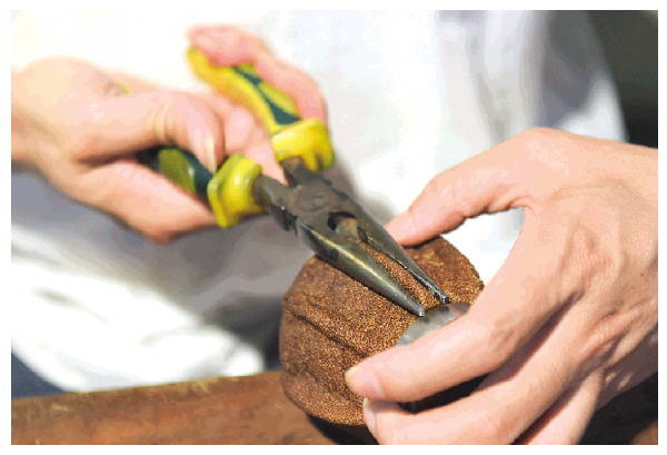 记者尝试捏柚皮,随着手指的用力,柚皮慢慢变得更加紧致、有型,确实让人欢喜。不过,随着持续用力,记者感觉手指的劲道越来越不足。王伯杨说,揉捏的过程,考验的正是手工艺人的耐力和毅力,如果二者缺其一,都无法顺利完成。此外,揉捏是否到位,不仅关系到柚罐的美观程度,还关系到柚罐的质量和使用寿命,“只有充分揉捏到位,柚皮起砂,才能实现防虫、防潮、防腐等功能”。
