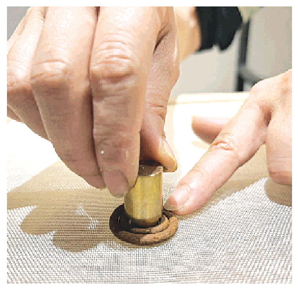 图⑤:用工具将长条的线香卷成盘香。 记者蒋璇 摄