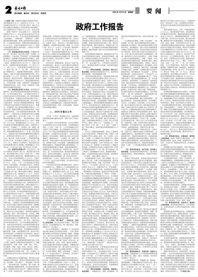 (五)扎实推进乡村全面振兴。守住保障粮食安全和不发生规模性返贫两条底线。整治撂荒及“非粮化”耕地5.36万亩,粮食生产实现面积、单产、总产“三增长”。实施粤桂协作项目34个,引进落地投产企业32家,消除返贫致贫风险1156户3829人。加快发展特色农业。农林牧渔业总产值连续三年全区第一。成功举办第三届南方花卉苗木交易会暨第五届广西花卉苗木交易会。(下转第二版)