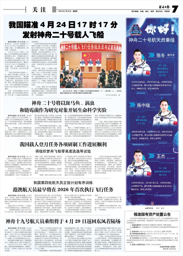 4月23日上午,神舟二十号载人飞行任务新闻发布会在酒泉卫星发射中心举行。中国载人航天工程新闻发言人、中国载人航天工程办公室副主任林西强会上表示,经任务总指挥部研究决定,瞄准4月24日17时17分发射神舟二十号载人飞船,飞行乘组由陈冬、陈中瑞、王杰组成,陈冬担任指令长。