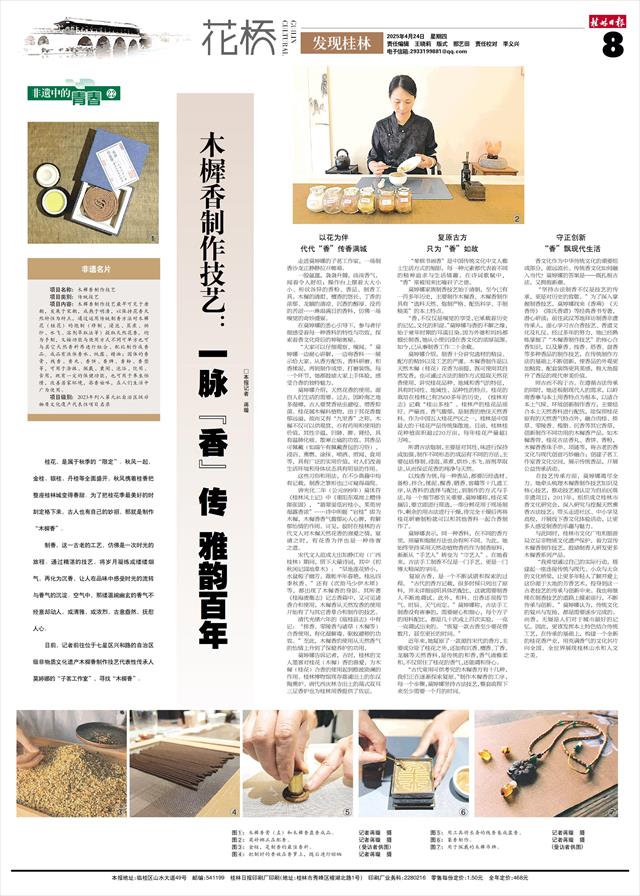 “我希望通过自己的实际行动,搭建起一座连接传统与现代、小众与大众的文化桥梁,让更多年轻人了解并爱上这份源于大地的芳香艺术,投身到这一古老技艺的传承与创新中来。我也将继续在制香技艺的道路上摸索前行,不断传承与创新。”莫婷娜认为,传统文化的复兴与发扬,都是需要逐步完成的。而香,无疑是人们对于城市最好的记忆。因此,更该发挥本土特色结合传统工艺,在传承的基础上,构建一个全新的桂花香产业,用充满香气的文化名片向全国、全世界展现桂林山水和人文之美。