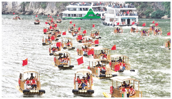 ▲游客乘坐电动竹筏游览漓江。(漓江景区供图)